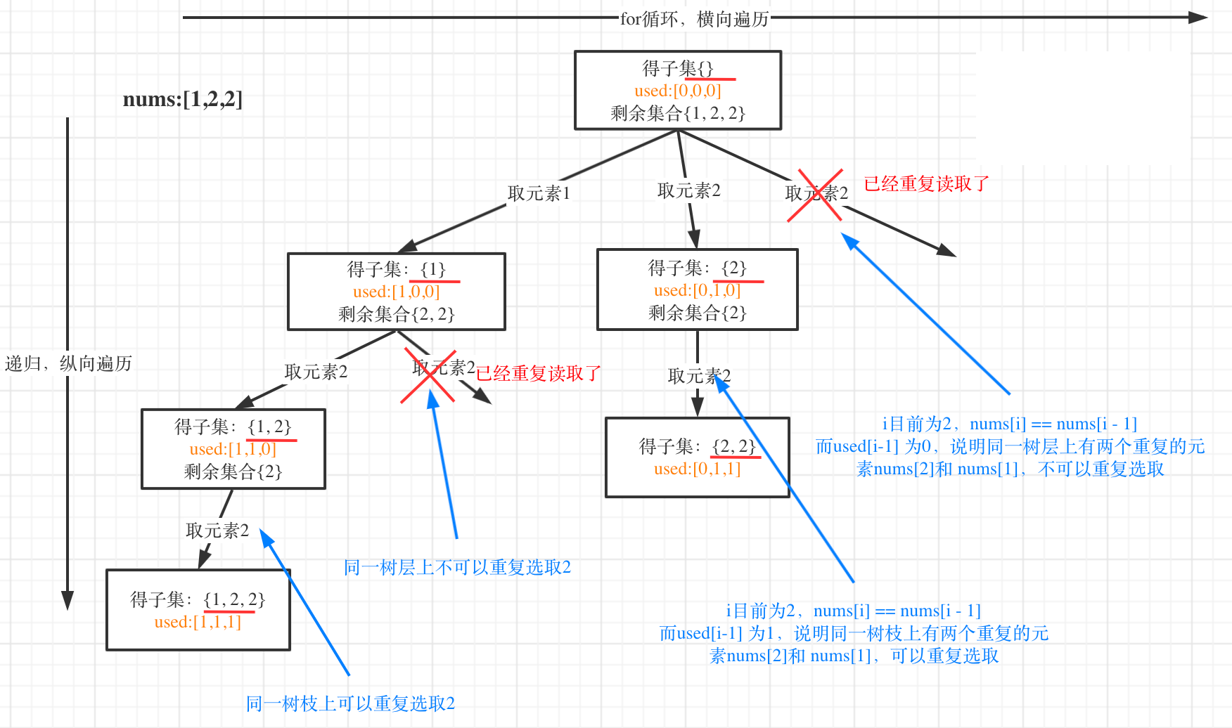 用示例中的[1, 2, 2] 来举例,如图所示: (注意去重需要先对集合排序)